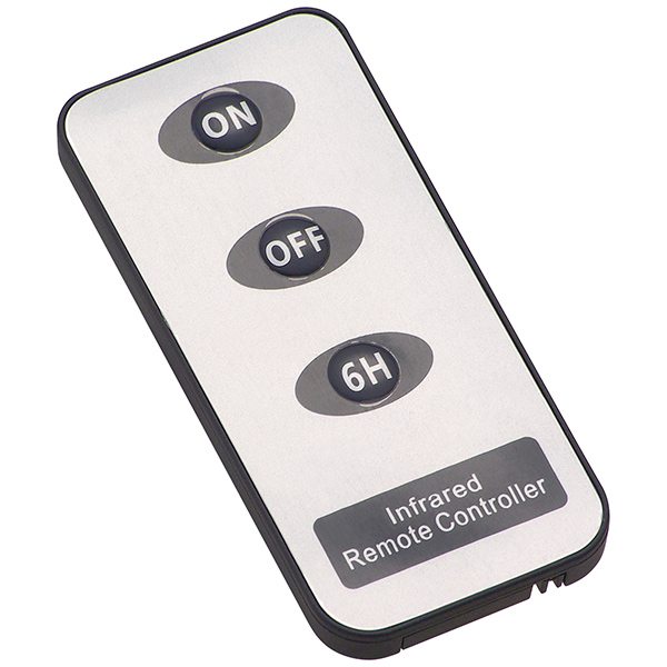 「いろはあかりローソク」専用リモコンです。電源のON/OFFが楽に切り替えられます。また、タイマー機能がプラスされ「6H」ボタンを押すと、「6時間点灯し、18時間後に再点灯」を自動的に繰り返します。