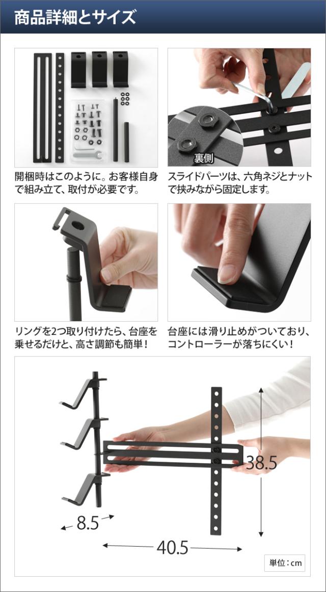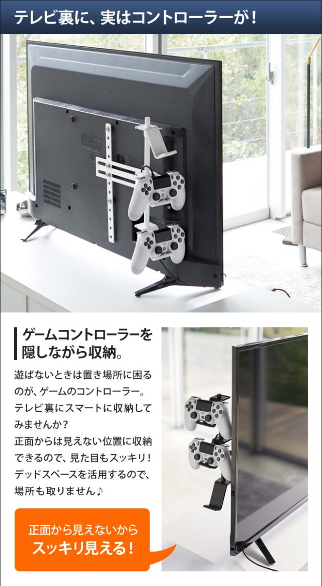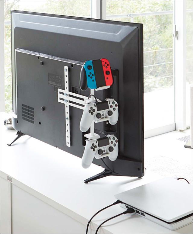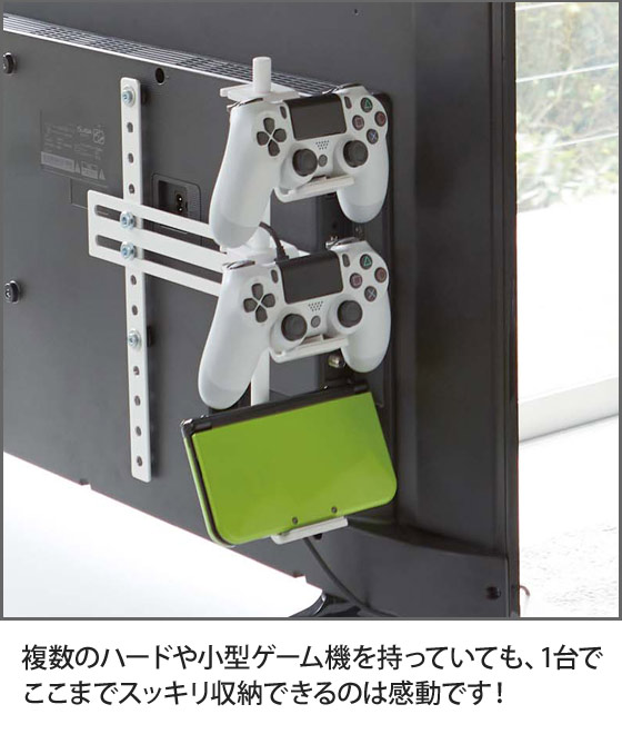 ゲーム機の機種を選ばず、コントローラーを3台までテレビ裏のデッドスペースに隠しながら収納できます。