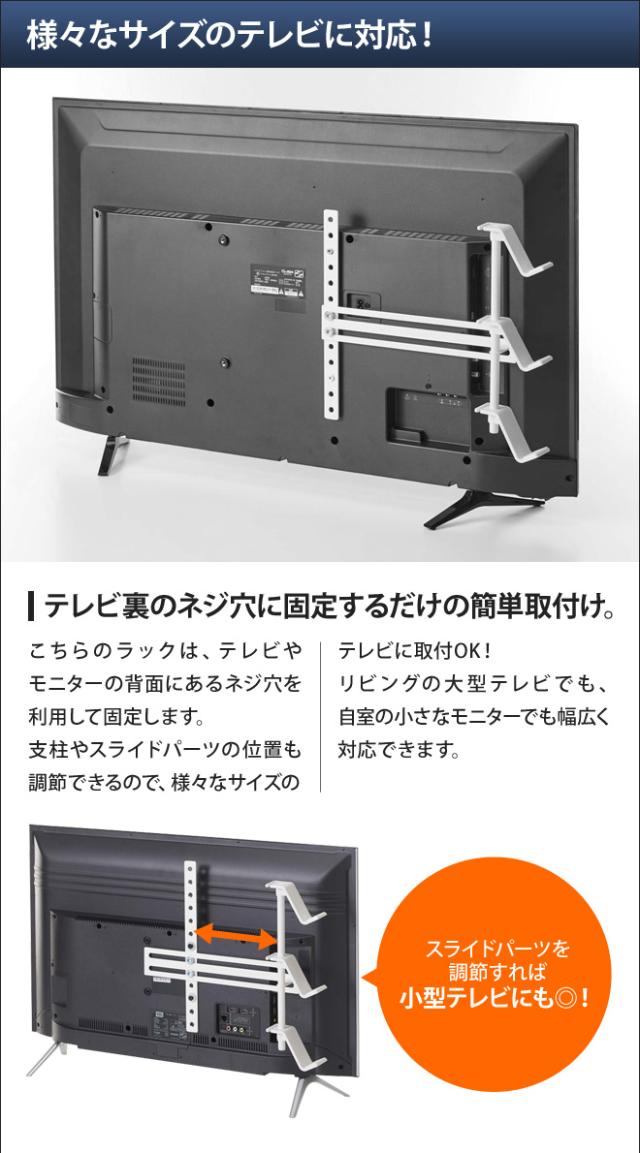 向きを変えればヘッドホンやヘッドセットも収納OK!リビングの大きいテレビから、自室の小さなモニターまで、幅広いサイズのテレビに取り付けられる点も嬉しいポイントです。