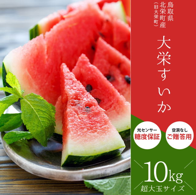 鳥取県東伯郡北栄町(旧大栄町)の寒暖差が大きい気候と、保水性・透水性が良く、栄養たっぷりの黒ぼく土壌で育った全国屈指のブランドスイカ「大栄スイカ」。光センサーで糖度などの品質を保証した、甘くてみずみずしい、シャリ感たっぷりのスイカをお届けします。当商品はご贈答用となります。