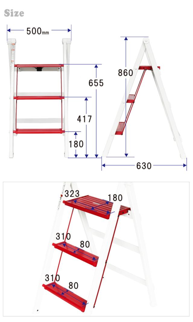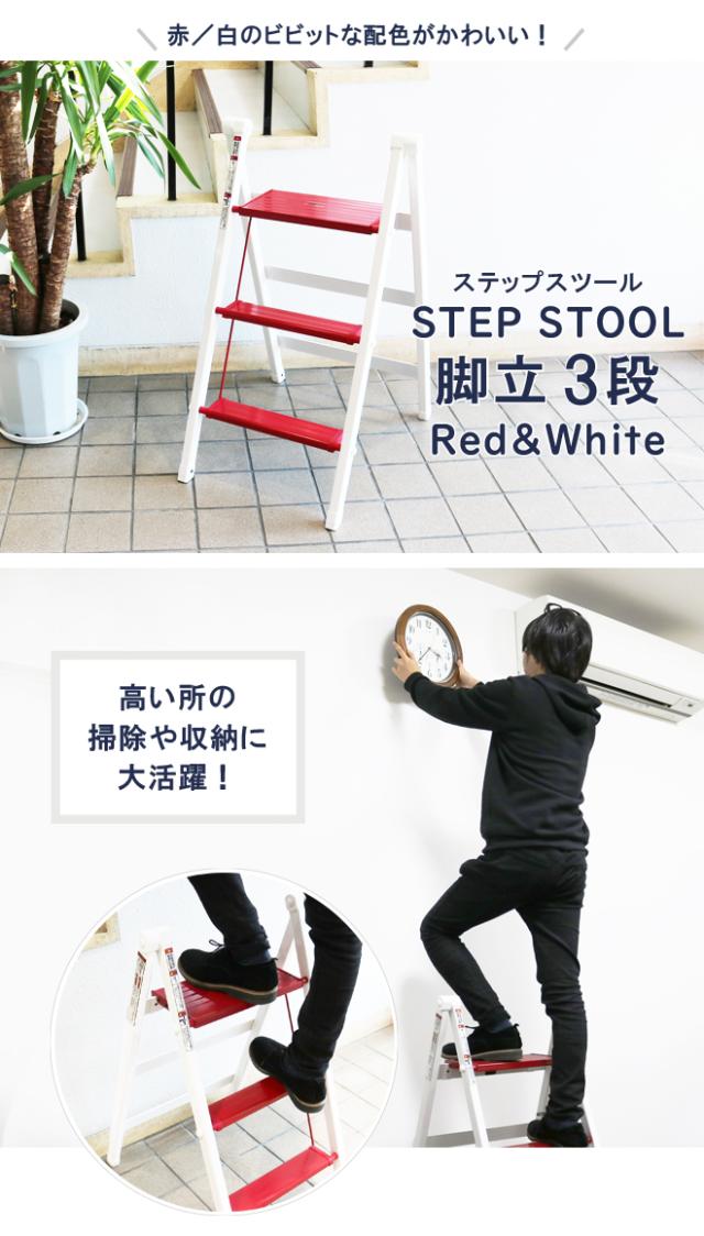 赤/白のビビットな配色がかわいい軽量脚立 ●片手で楽に持ち運びができる、軽くて丈夫な3段のアルミ製脚立です ●室内やガレージなど、高い所の掃除や収納に活躍します ●赤/白の配色がかわいい脚立は、お部屋のインテリアや飾り棚としても使えます ●脚部の裏には滑り止め加工が施されているので、安心です ●コンパクトに折りたためるので、ちょっとした隙間に収納できます ●商品は完成品なので、すぐにご使用いただけます (こちらの商品は組立て済みの商品を簡易包装でお届けします) ※脚部を完全に開き、しっかり固定されているのを確認してご使用下さい ※不安定な場所でのご使用は危険ですのでおやめ下さい 品番:KT-3RW |