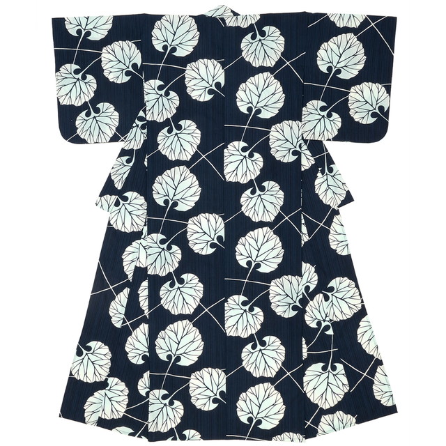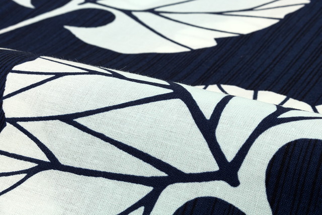 細かい雨縞にフキの葉が揺れるレトロモダンなデザインです。