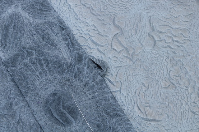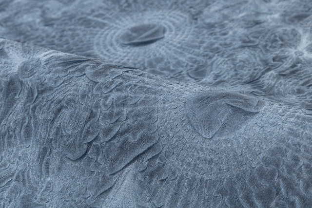 立体的なシワ加工で、ボリュームのある花々を浮かび上がらせた華やかなデザインです。