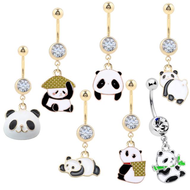 金メッキしたサージカルステンレス316L製の臍ピアスにクリスタルのジルコニアをセットし、色々なカワイイポーズをとったパンダのチャームが揺れる動物アニマルモチーフのへそピアス型ボディピアス。