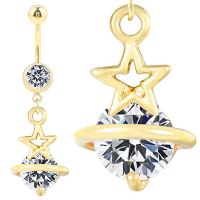 金メッキしたサージカルステンレス316L製の臍ピアスにクリスタルのジルコニアをセットし、クリスタルのジルコニアで土星と星をイメージしたチャームが揺れるへそピアス型ボディピアス。