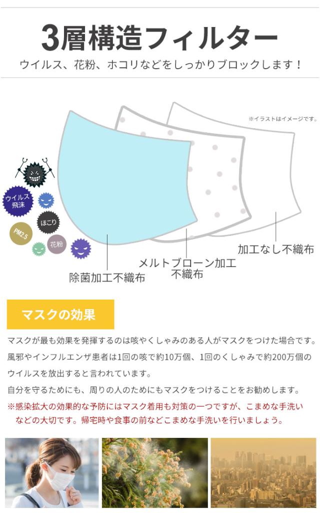 飛沫ウイルス、ハウスダスト、風邪、花粉、PM2.5等をガードする、不織布の3層構造フィルターを使用したマスク。