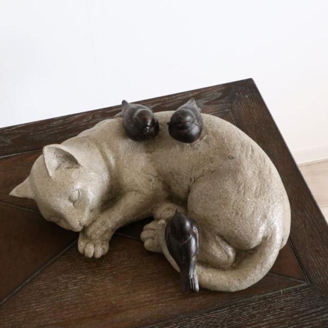 とてもかわいいネコの置物オブジェです。鳥がネコのお昼寝中に集まってきました!