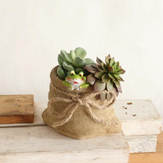 小さなカエルが中から覗いているかわいいプランター(鉢カバー)です。