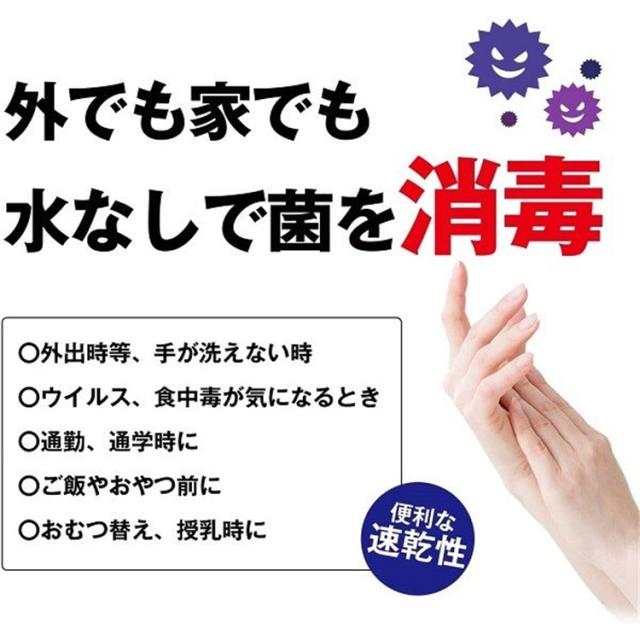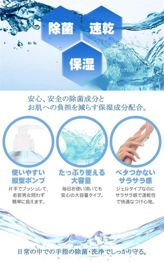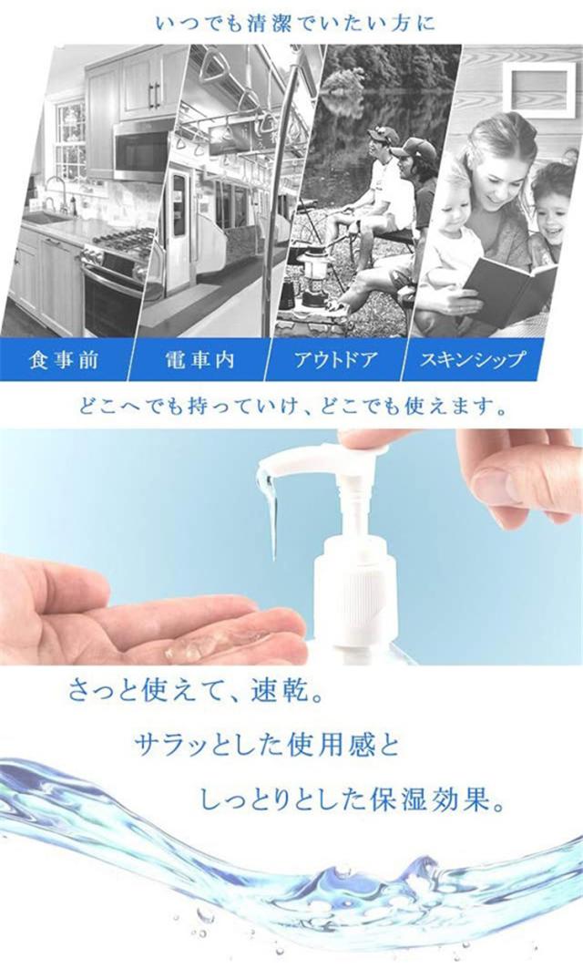 お肌にやさしい保湿成分配合、水なしで使える速乾性、使用でサラッと使用感、手指と皮膚の洗浄消毒が行えます。