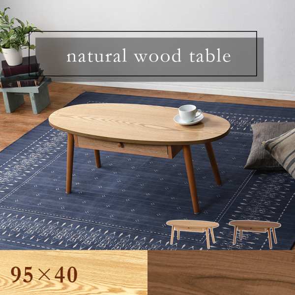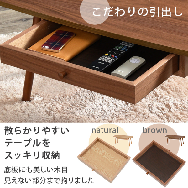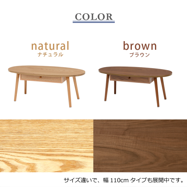 センターテーブル 楕円型 幅95cm ブラウン 引出し付き 天然木 両側スライド テーブル ローテーブル オバールテーブル 代引不可