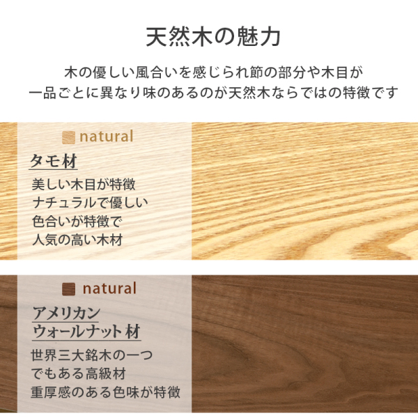 ・一品ごとに異なり味のあるのが特徴の天然木の魅力。