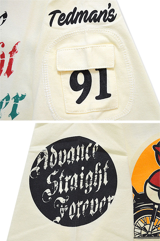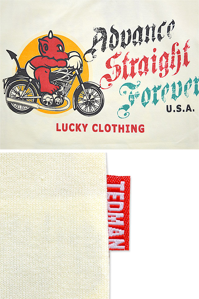 テッドマンから「RED DEVIL M.C.半袖Tシャツ(TDSS-517)」のご紹介です! 人気のモーターサイクルデザインから最新作が登場! バックには、テッドマンの周囲に様々な字体でレタードをプリント。 フロント中央には、バックに用いた絵柄をワンポイントでプリント。 生地はストレッチのきいた、さらりとしたものを使用。 | ||||||||||||||||||||||||||||||