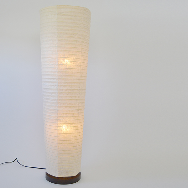 飽きのこないシンプルな円筒型のフロアライトです。太鼓をイメージしたボリューム感のあるデザインとなっています。美濃機械すき和紙の繊維がはいった紙とオリジナルの美濃手漉き和紙の模様が心安らぐ空間を演出します。