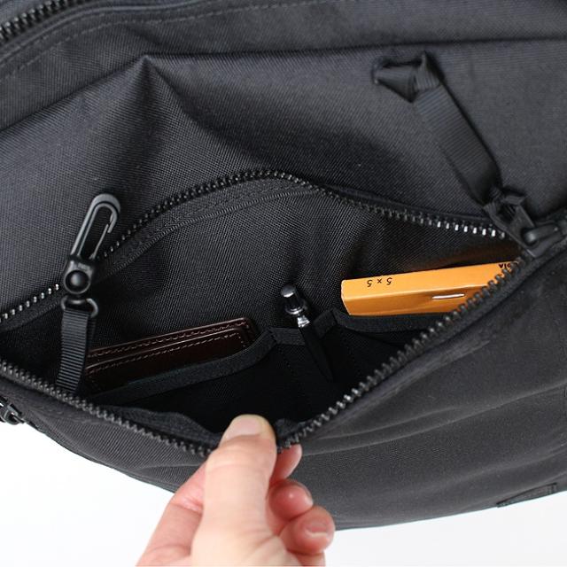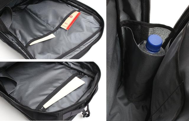 フロントのデザインに使い勝手が良い3つのファスナーポケットのデザインを主に取り入れ、一番大きなファスナーポケットの内装には伸縮性のあるパワーネット素材のポケットとペン差し、キーフックが付きます。その他の2つのポケットは文庫本やスマートフォン、パスケースやポケットティッシュなどの取り出し頻度の高い様々な収納物に適したサイズになっています。また、PCやタブレットの収納に適したポケットを備え、トロリーバー通しも取り付けています。