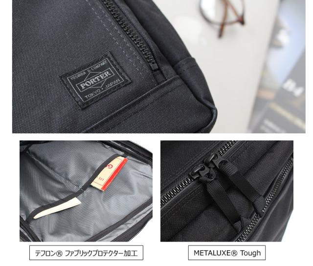 PORTER INTERACTIVE軽量で撥水性にも優れ、デイリーユースとしての機能性を充実させた、幅広い年齢層に向けたベーシックなケミカルビジネスシリーズです。 本体生地は600デニールのポリエステルオックスで、裏面にTPU加工を施した素材を採用しています。TPU(サーモプラスチックポリウレタン)はPVCに比べて軽量で耐久性も高く、環境にも優しいことからアウトドアブランドでも非常に多く採用されている加工です。 ファスナーには軽さと操作性の良さを重視しつつ、見た目は金属ファスナーのように見えるMETALUXE Toughと呼ばれるYKKビスロンの高強度タイプを採用しました。ムシ(エレメント)の樹脂にガラスファイバーを練り込み、通常のビスロンファスナーより165%の高強度化、金属ファスナーより56%の軽量化を実現しています。 裏地は420デニールのナイロンオックスの表面に、テフロンファブリックプロテクター加工をして堅牢性を高めました。汚れが付着しづらい特性を活かし、グレーカラーを採用してカバンの中身の視認性を高めています。