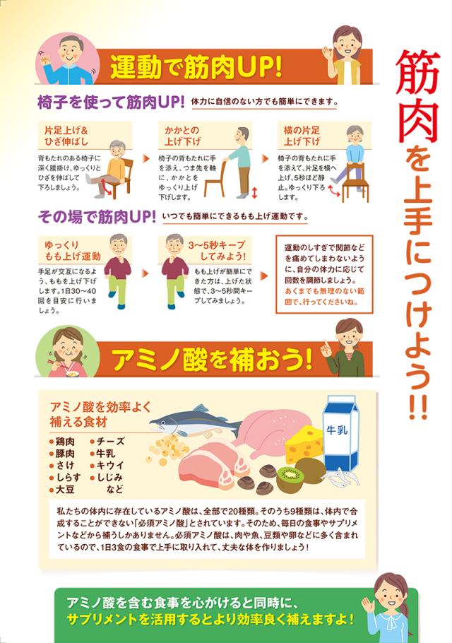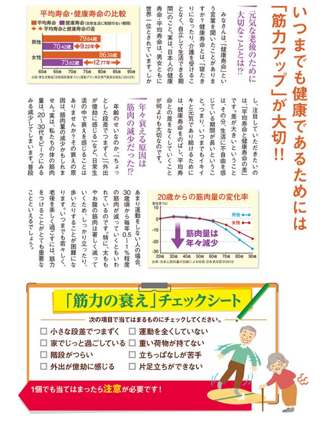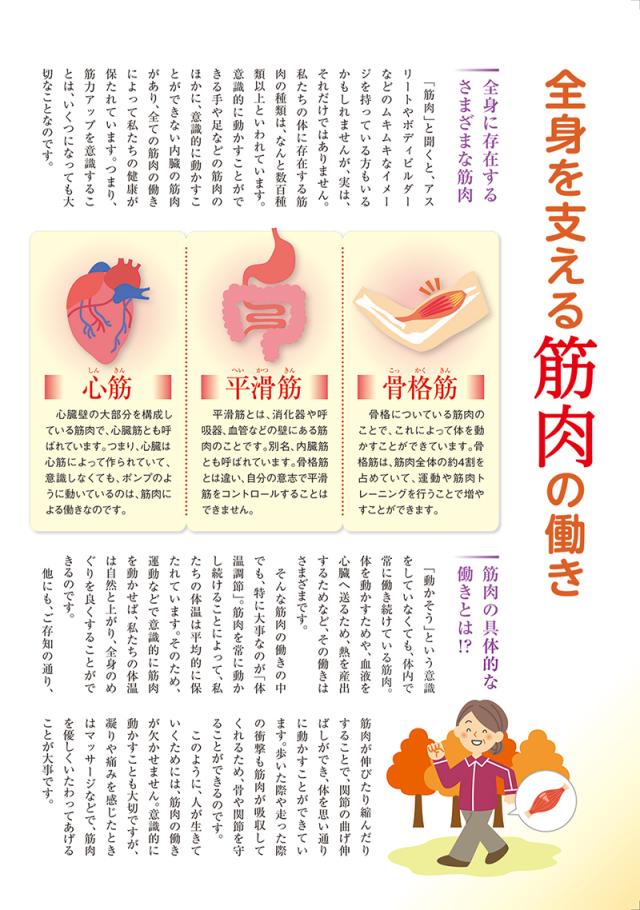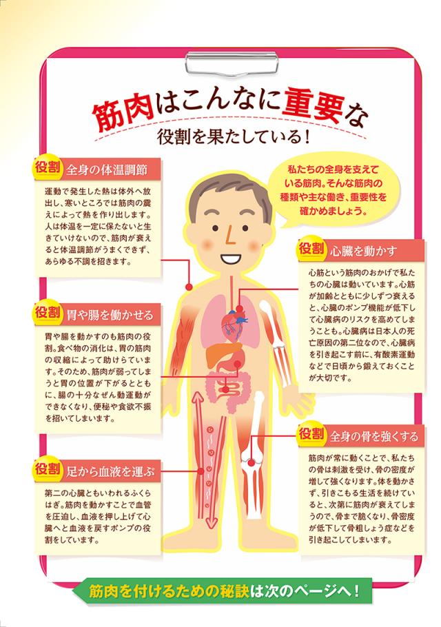 いつまでも健康であるためには筋力アップが大切!全身の体温調節や胃腸の動きをサポート、血液を運び、骨を強くしたりなど元気の源は筋力から!