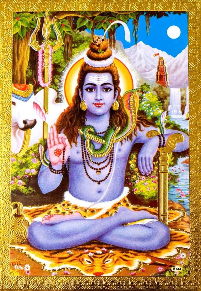 ヒンドゥー教の重要な3人の神の中の1人、シヴァ神です。世界の破壊神で、破壊は次の創造を産むことから、えらいとされている。シヴァはヒマーラヤに住む、ヨガ行者の姿をしていて、頭から水を流しているのが特徴。その水はヒマラヤに注ぎ、聖なる川、ガンジス川の源となるとされる。とても人気のある神様です。■デコレーションされたポストカード