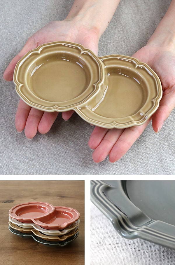 お箸を置く窪みの付いたプレートです。小さなプレートが2つくっついた面白いデザインです。副菜を2品盛り付けたり、薬味とお醤油を分けて入れたり、タレやソースも混ざらずに入れられます。まるでお花のようなレリーフ(ふちのデザイン)が食卓のアクセントとなり、落ち着いたニュアンスカラーがお料理をより一層引き立てます。