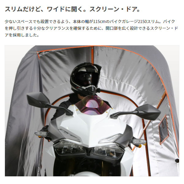 バイクガレージ2150スリムは、少ないスペースでも設置しやすいサイズに工夫を凝らした、
