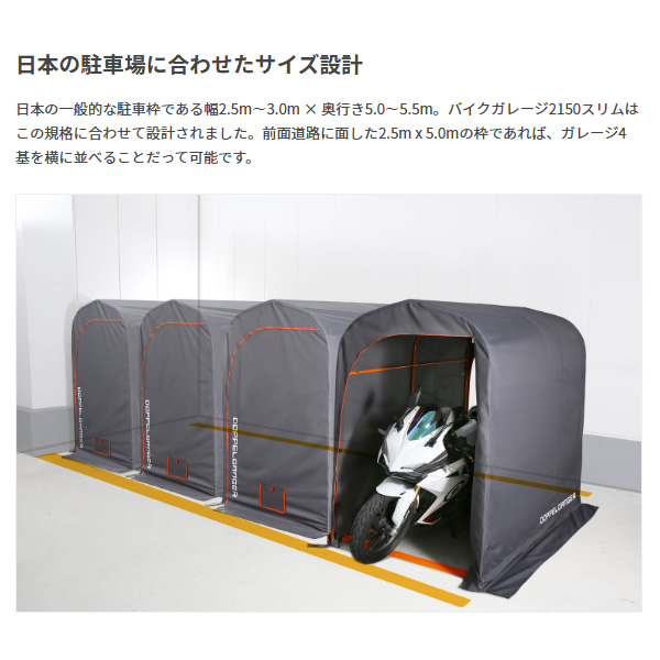 日本の一般的な駐車枠である幅2.5m〜3.0m × 奥行き5.0〜5.5m。バイクガレージ2150スリムはこの規格に合わせて設計されました。前面道路に面した2.5m x 5.0mの枠であれば、ガレージ4基を横に並べることだって可能です。
