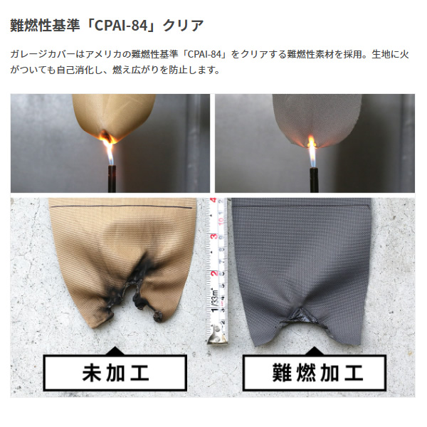 ガレージカバーはアメリカの難燃性基準「CPAI-84」をクリアする難燃性素材を採用。生地に火がついても自己消化し、燃え広がりを防止します。