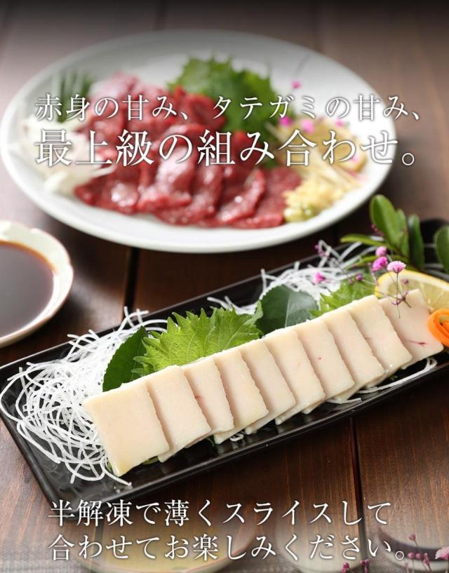 | 内容量 | 馬刺しヘルシー赤身 200g 馬レバー刺し 100g馬タテガミ刺し 100g 馬刺し専用タレ(規定量) | |