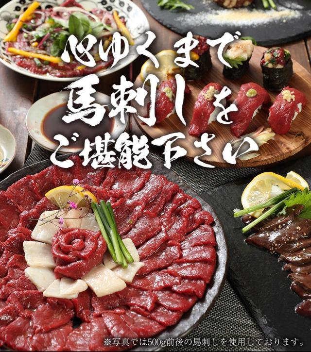 | 備考 | 馬刺し1パックは100g程の食べきりサイズです。高度な急速冷凍技術によって、細胞中の水分を超微粒子状態で凍結してあります。このため冷凍状態での外観は白茶褐色に見えますが、解凍すると真紅の馬刺し色に戻ります。 当店の霜降馬刺しは、ゆっくりと穀物飼育された自然霜降肉です。注入による加工霜降肉ではありません。 |