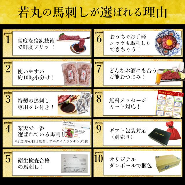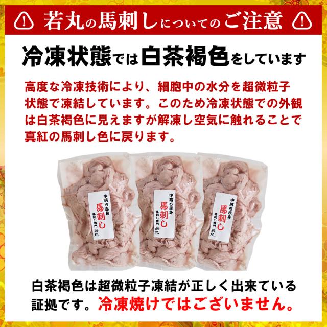| 安心安全 | 馬刺し専門若丸では、生食用商品全ロットについて公的検査機関で衛生検査を行い、生食用肉基準に適正である合格証明書が発行された商品だけを合格品としてお届けします。更にロット番号管理によるトレーサビリティーも可能で、お客様に届けられた商品に万全の管理を徹底しております。尚、お召し上がりの際は他の精肉、魚貝、野菜類と包丁やマナ板等を混同しないように十分な衛生的配慮をお願い致します。 | |