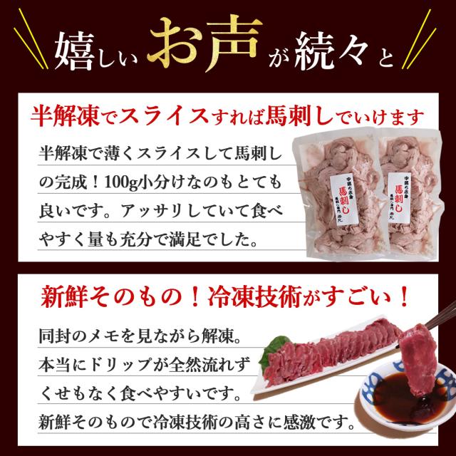 ●形を気にしなければ立派な馬刺し♪ 馬刺し整形時にできる端肉です。品質は赤身馬刺しと全く同じ!リーズナブルで大人気!●1パック約100gの小分けで大人気!うれしい食べきりサイズだから、まとめ買いも安心♪冷凍庫に馬刺しをドーンとストックできます。