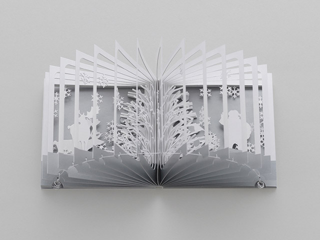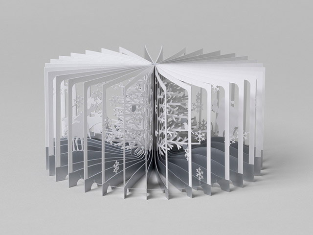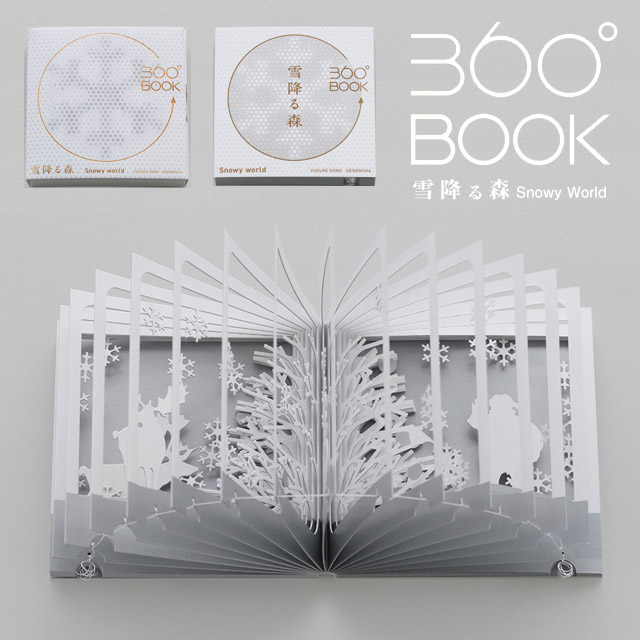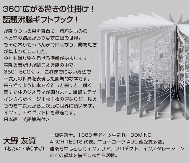 もみの木がてっぺんまで白くなり、動物たちが集まりだしました。今年も贈り物を届ける準備が始まります。 雪降る音だけが聞こえる森の中で。360°BOOKは、これまでにない方法で三次元の世界を表現した画期的な本です。 円を描くように本をぐるっと開くと、瞬く間に立体のジオラマが現れます。 繊細にデザインされたページ1枚1枚の連なりが、見るものを二次元から三次元の世界に誘います。インテリアやギフトにも最適です。 日本語/英語解説付き