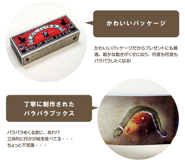 細かな動きがくせになり 何度も何度もパラパラしたくなる! 「むしくいさま」と昆虫のストーリー 君を形作るのは、僕。君を描いたのは僕。 僕がいるから、君は存在できる。