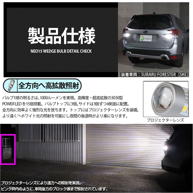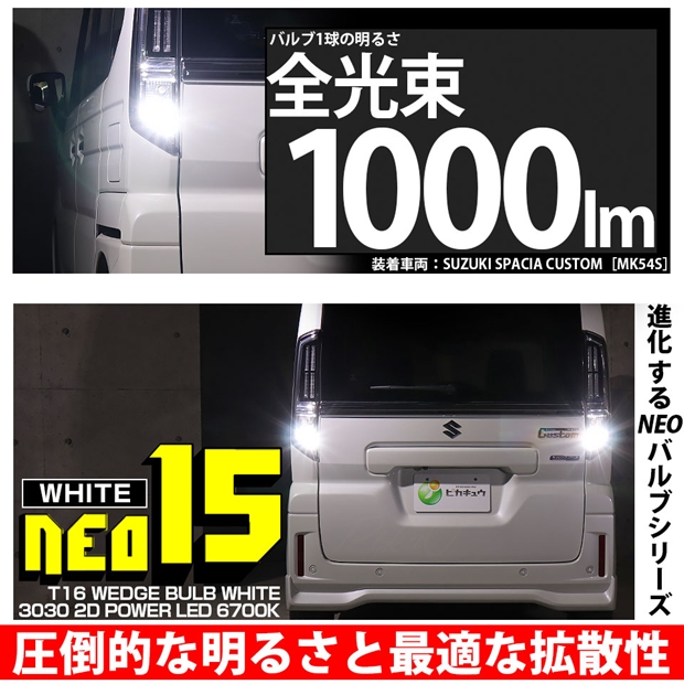 3030型 POWER LED 搭載 NEO 15 全光束1000lm T16 バックランプ用LEDバルブ 全光束1000lm|ホワイト6700K|定電流回路搭載|全方向照射|1セット2個入り|18ヶ月保証 |
