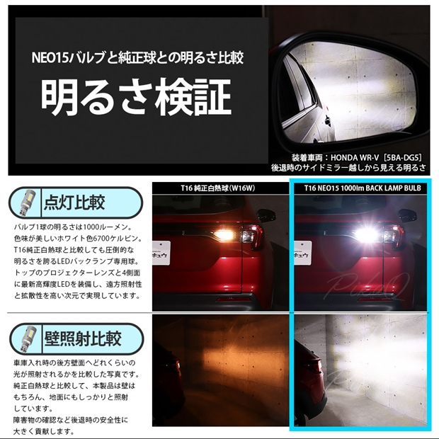 ピカキュウ,T16 LED,T16 LED 1000lm,NEO 15 1000lm,ネオ15 1000lm,バックランプ LED 明るい,T16 バックランプ 明るい,1000lm バックランプ,W16W LED,ホワイト LED,6700K バックランプ,3030 LED,定電流回路 LED,極性有り LED,バック LED