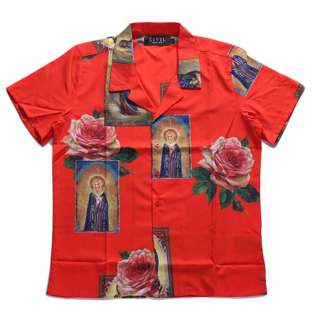 ラスト1点【33%OFF】シヴィルレジーム CIVIL REGIME 半袖シャツ 柄シャツ アロハシャツ メンズ レディース 赤 S かっこいい おしゃれ キリスト マリア 薔薇 バロック調 総柄 ゆったり 18-100745