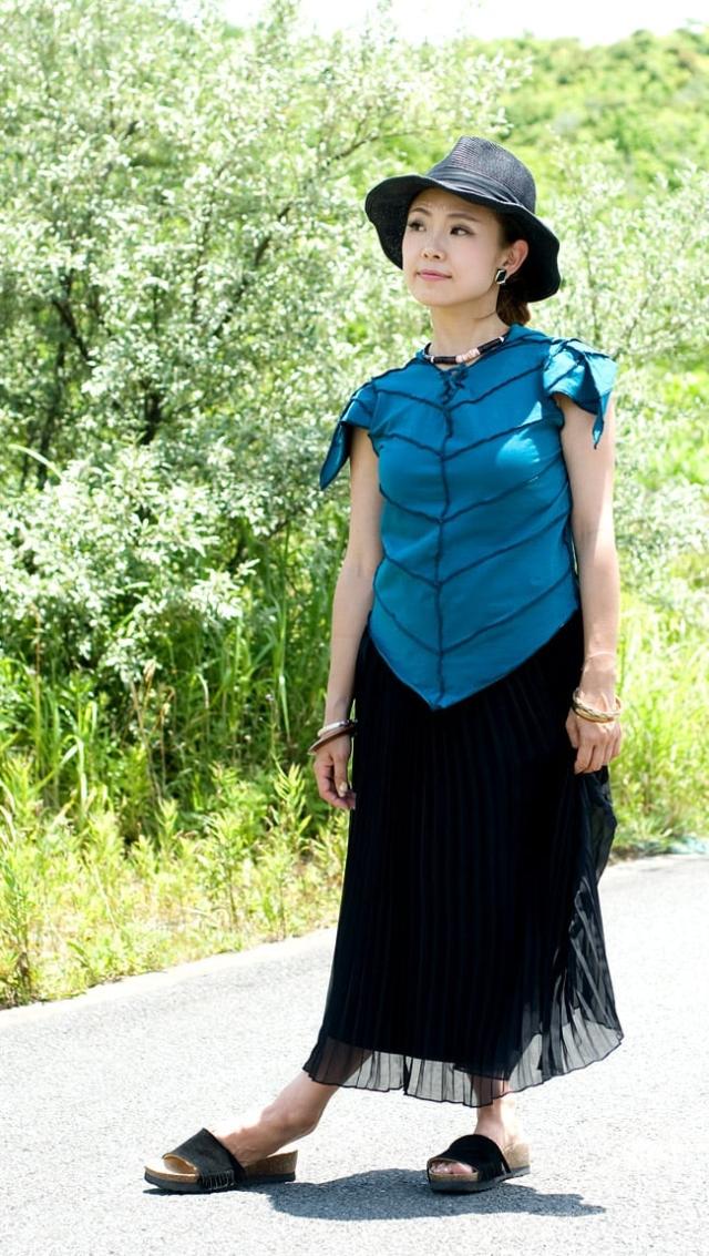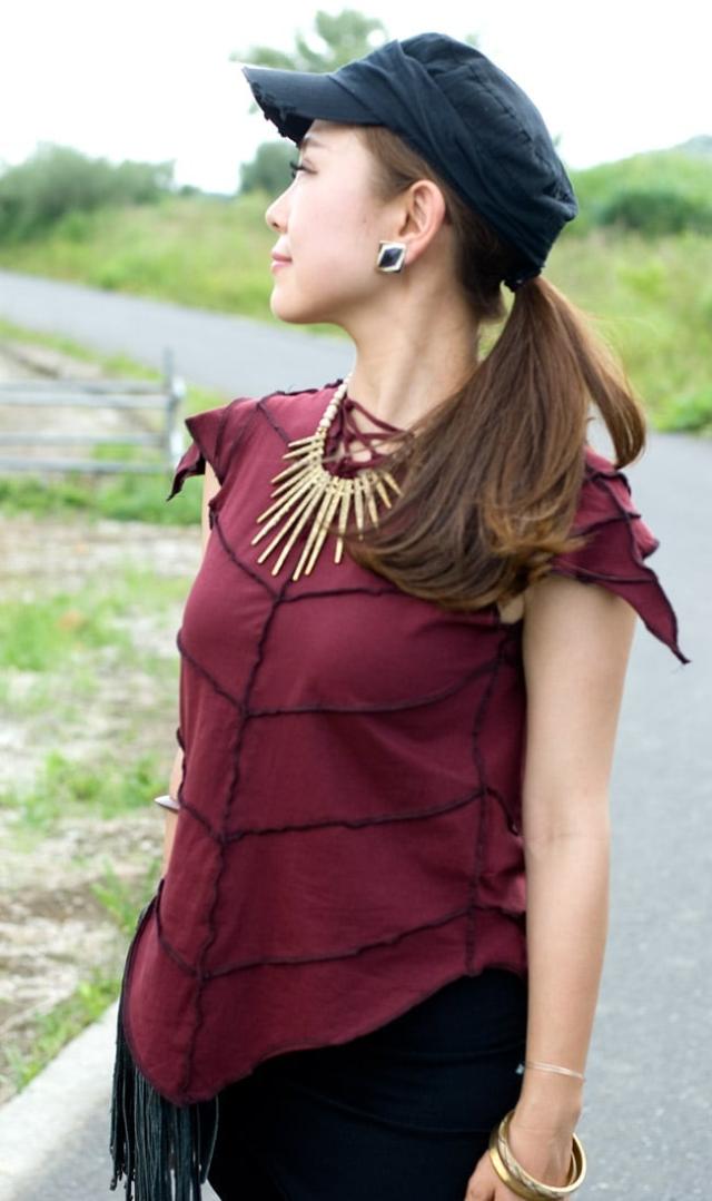 深い森に佇む妖精のようなシルエットでとんがりパーカーが個性的なTシャツです。背中は大きく開いていて、紐で編み上げるデザイン、布地を縫い合わせたパッチワークデザインも個性ある仕上がりになっています。フロントスタイル、バックスタイル、袖口、三角の尖った仕上がりがどれもユニーク。まるで森の妖精のような個性的なフォルムです。■しっかり伸縮、ライクラ素材