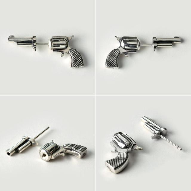 リボルバー式の拳銃を模したデザインのピアス。着けると耳を貫通しているように見えるユニークなデザインです。その精密さも相まって、思わず目を引いてしまうインパクト抜群なアイテムです。
