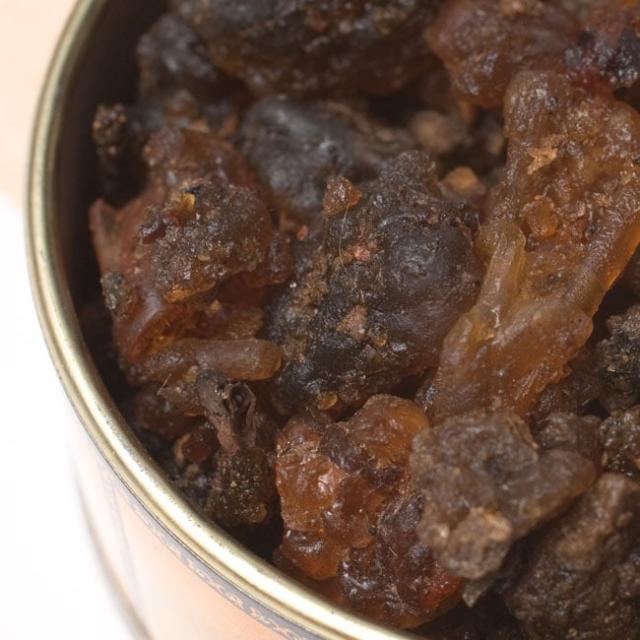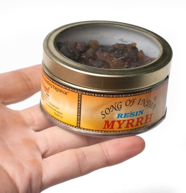 没薬(もつやく)は南アフリカやアラブ諸国に自生する樹木から分泌される樹脂を採集して作られた樹脂香です。ピュアな樹脂香ですので炭の上に乗せると溶けながら煙を出します。没薬は古くから香として焚いて使用されていた記録が残されています。聖書にも多くの記載があり、出エジプト記には聖所を清めるための香の調合に没薬が使用された記述があります。