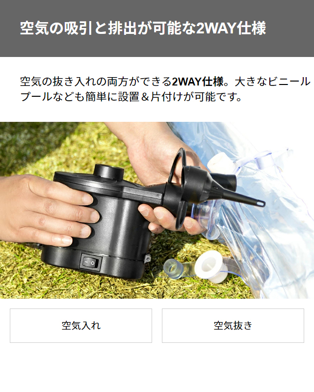 電動エアーポンプ 電池式 電動空気入れ 電動ポンプ 電動エアポンプ 自動空気入れ 空気抜き対応 屋外 ビニールプール用 浮き輪用 ビーチボール用 エアーボート用 エアーマット用 水遊び 海水浴 レジャー ソロキャンプ