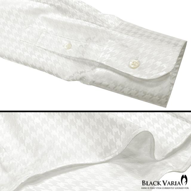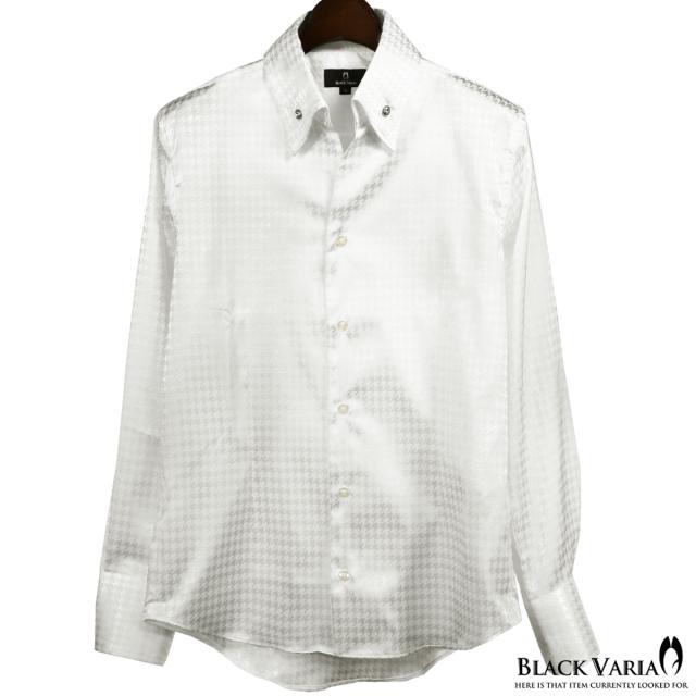 サテンシャツ ドレスシャツ スワロフスキー釦 スキッパー 長袖 千鳥格子柄 日本製 ボタンダウン メンズ スリム(ホワイト白) 191255