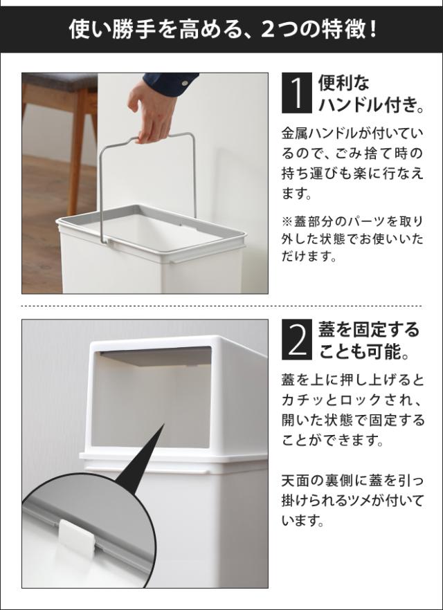フタにはバネが仕込まれているので自動で閉まり、片手でも楽にごみ捨てができます。開けっ放しにしたいなぁと思ったら、天面裏のツメにカチッとはめるだけで固定しておくこともできますよ。