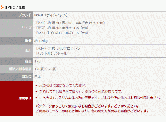 ・こちらは17Lスリム本体のみの販売です。ゴミ袋やその他のゴミ箱は付属しません。