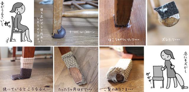 イス脚カバーは外れたり、イス脚ソックスは脱げたり、粘着付きシートは床がベトベトになったり…