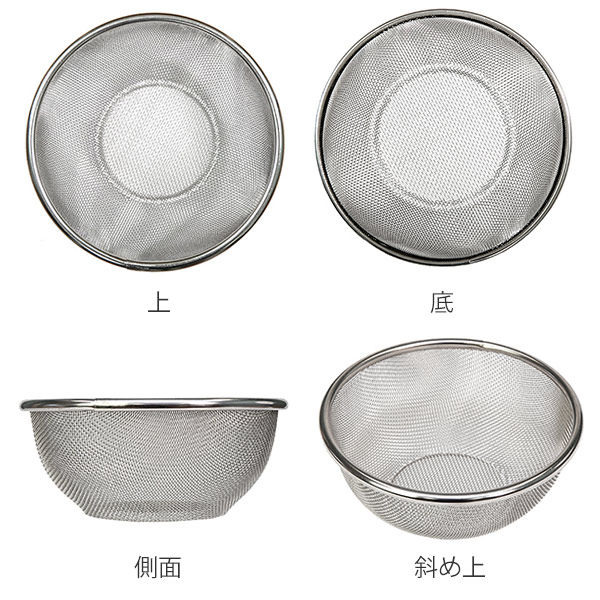 ![]() ![]() 金具を無くしたシンプルな底面 通常のザルには底面に金具がありますが、こちらの「エリートざる」は底面の脚を本体の網から成形する独特なデザインでつなぎ目がなく、食材が挟まって取れないということもありません。シンプルな底面はスポンジが引っかかることなく綺麗に洗えるので、いつでも清潔です。また外付けの補強線がないので、補強線が外れたり接合部分の網切れの心配もありません。 ![]() 使い込んでも変わらない美しさ 丈夫でさびにくい18-8ステンレス素材を使用しているので、美しい輝きです。大阪の工場で網を編むところから仕上げまで丁寧に一貫生産しているので、型崩れしにくく長く愛用して頂けます。 ![]() ![]() 網目が細かく水切れ抜群 丈夫で細やかな16メッシュの網を使用しています。網目が細かいので麺類やひじき等の食材が詰まったり水滴が溜まったりしにくいのに、水切れも抜群に良いです。また、洗いやすく乾きも早いのでお手入れが簡単です。 ![]() ザル 16.5cm 手のひらサイズのザルは、少量の野菜やフルーツ等の水切りにオススメです。またフルーツ等を水切りし、小皿を敷いてそのままテーブルに出すことで洗い物も減り家事の時短にもなります。 ![]()