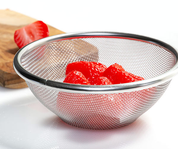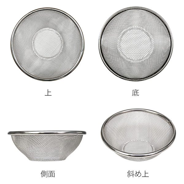 ![]() ![]() 金具を無くしたシンプルな底面 通常のザルには底面に金具がありますが、こちらの「エリートざる」は底面の脚を本体の網から成形する独特なデザインでつなぎ目がなく、食材が挟まって取れないということもありません。シンプルな底面はスポンジが引っかかることなく綺麗に洗えるので、いつでも清潔です。また外付けの補強線がないので、補強線が外れたり接合部分の網切れの心配もありません。 ![]() 使い込んでも変わらない美しさ 丈夫でさびにくい18-8ステンレス素材を使用しているので、美しい輝きです。大阪の工場で網を編むところから仕上げまで丁寧に一貫生産しているので、型崩れしにくく長く愛用して頂けます。 ![]() ![]() 網目が細かく水切れ抜群 丈夫で細やかな16メッシュの網を使用しています。網目が細かいので麺類やひじき等の食材が詰まったり水滴が溜まったりしにくいのに、水切れも抜群に良いです。また、洗いやすく乾きも早いのでお手入れが簡単です。 ![]() ザル 14.5cm 手のひらサイズの小ぶりのザルは、少量の野菜やフルーツ等の水切りにオススメです。目が細かいので、粉ふるいの代用としてもご使用頂けます。またフルーツ等を水切りし、小皿を敷いてそのままテーブルに出すことで洗い物も減り家事の時短にもなります。 ![]()