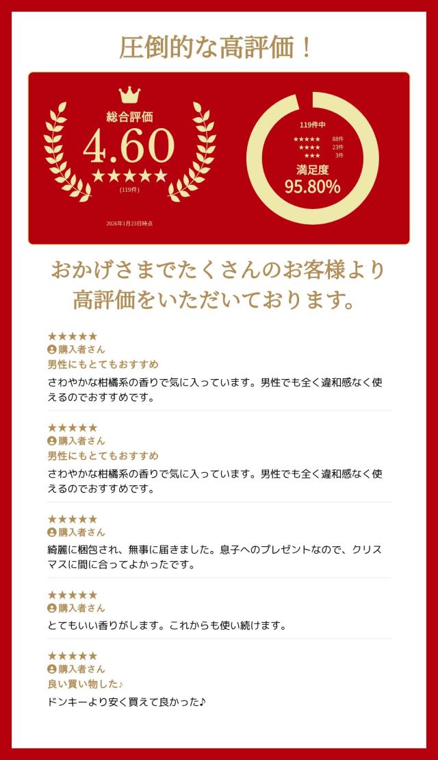 - 配送まで早く、また梱包も丁寧で 大満足です。15年愛用してる香水 なので、お店で購入するより、安かったので ありがたいです。また是非購入したいです。 ありがとうございました。