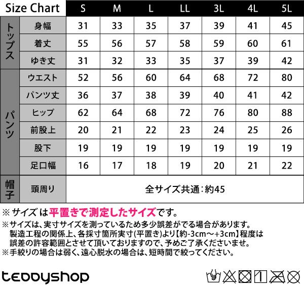 ※トップスの身幅は平置きの片面、パンツのウエストは腰幅の2倍値を記載しております。