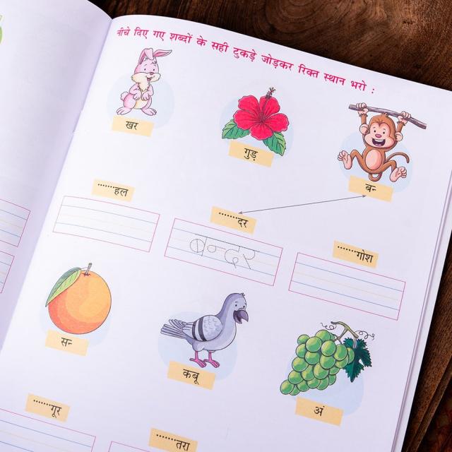 インドの子供たちが、イラストを見ながらデーヴァナーガリー文字をなぞって学ぶための教材です。いわば、インド版あいうえお書き方帳ですね。パート1では簡単な単語を学習し、パート5までじょじょに難しくなっていきます。徐々にステップアップしていくのがいいですね。