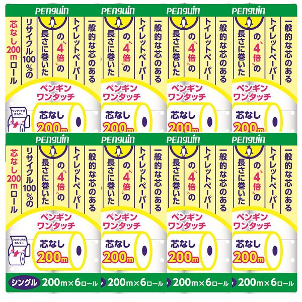 [8個セット]トイレットペーパー 6ロール 8個セット ペンギン ワンタッチ芯なし(再生紙) 200m×6R シングル 白 2741 (D) 芯なし 長巻き 備蓄 業務用 再生紙 シングル 丸富