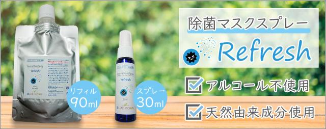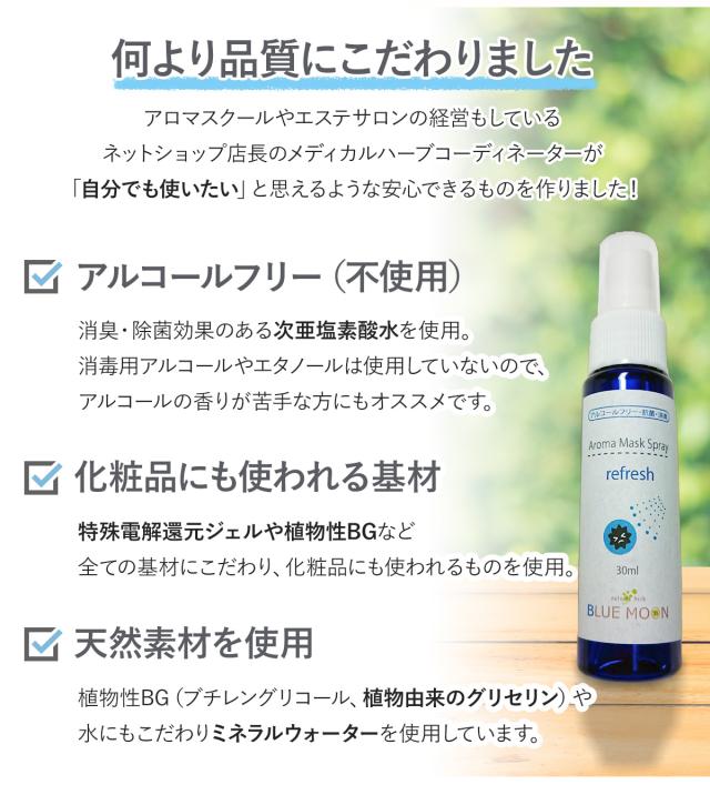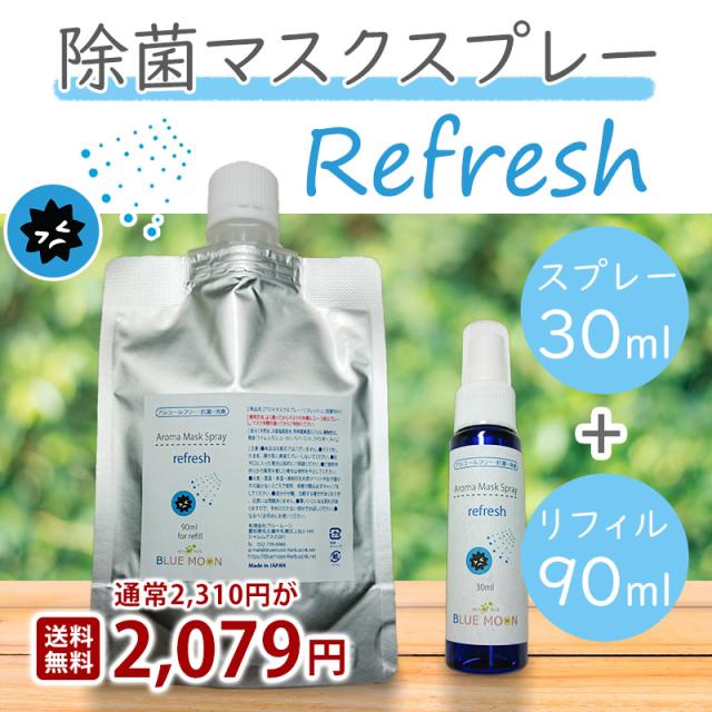 マスクスプレー リフレッシュ 30mlスプレー+90mlリフィルセット 除菌 アロマスプレー 次亜塩素酸水 ライム レモン ユーカリ ペパーミント ラベンダー タイム の精油をブレンド アルコール不使用