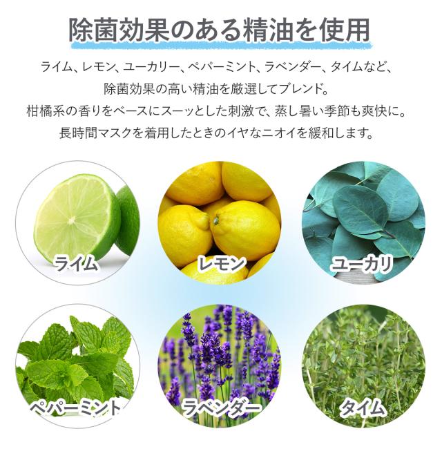 ライム、レモン、ユーカリー、ペパーミント、ラベンダー、タイムなど、除菌効果の高い精油を使用。